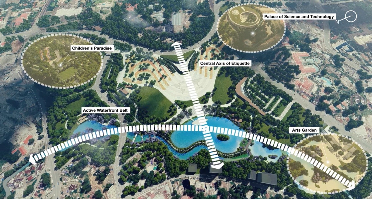 文化禮儀軸是中央廣場東西向主軸線,包含四個節點,結合現狀地形由高向低依次為演講臺(Rostrum)、中心廣場(Central Rally Plaza)、湖畔噴泉音樂廣場(Lakeside Fountain Music Square)、人工湖。這里將成為體現國家精神象征,具有向心力的政治文化活動場所。