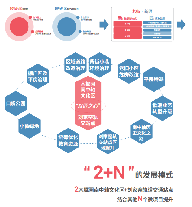 東鐵匠營街道位于北京南三環(huán)中部,區(qū)位優(yōu)勢明顯,歷史悠久,具有深厚的文化底蘊。城市更新規(guī)劃范圍是東鐵匠營街道轄區(qū)3.1平方公里范圍內(nèi),常住人口10.1萬,下轄18個社區(qū)和1個村。規(guī)劃提出“老街新匠”的發(fā)展理念,定位圍繞居住功能服務的城南文化健康新中心,制定了城市更新微更新(80%)和集中改造(20%)相結合的發(fā)展策略,制定了街區(qū)層面“一帶五橋、兩點多片區(qū)”的空間結構,制定了“2+N”的發(fā)展模式,即:圍繞“微中心”建設以木樨園南中軸文化區(qū)和劉家窯軌道交通站點為重要抓手和著力點實施集中提升和改造,以“N”個微項目提升為抓手實施精細化改造,補齊民生和公共設施短板,提升地區(qū)人民生活質量,發(fā)展蘊含歷史文化氣息的新興商業(yè),打造城市更新、街區(qū)治理的鐵營模式。