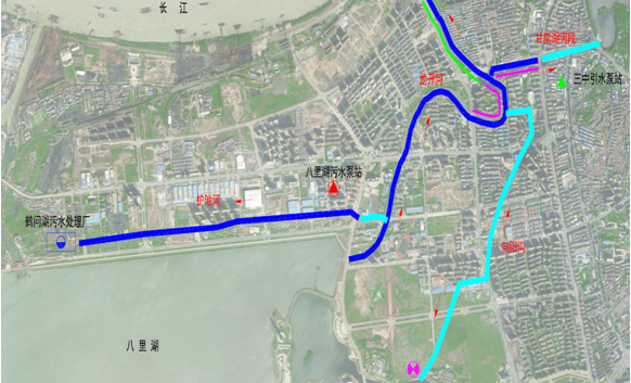 九江市城區內主要水系有八里湖,南湖,甘棠湖,白水湖,琵琶湖等五大湖。龍開河南起八里湖東北端,西至官牌夾,全長3.465km,龍開河有3條支流,分別為護池河(2.8km)、向陽溝(2.5km)以及甘棠湖河段(1.153km)。現狀水質為劣Ⅴ類水體,局部為重度黑臭。