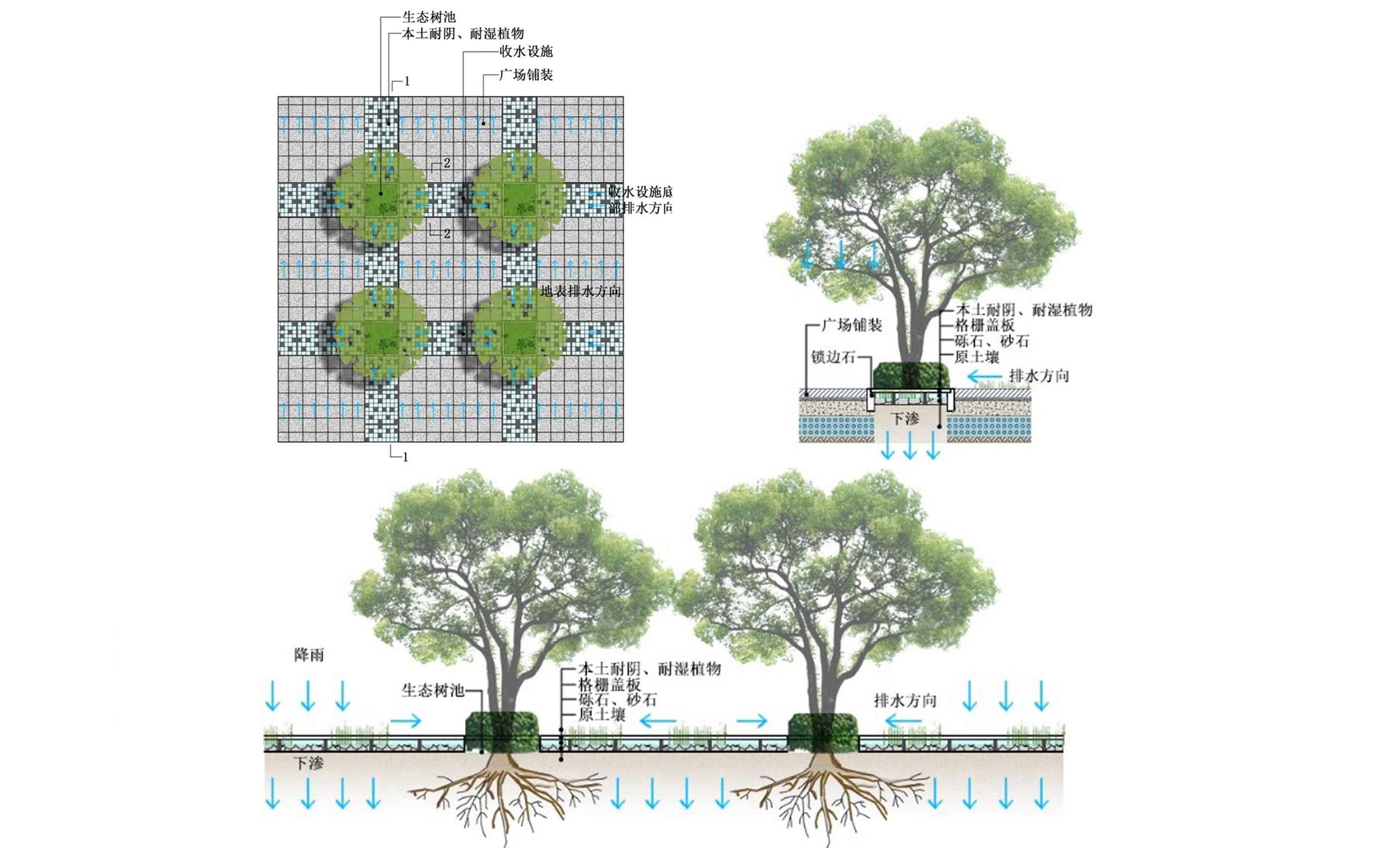 當獨立的生態樹池無法滿足降雨量大城市的雨水調蓄需求時,可利用樹池之間的空間,增設雨水收集設施,擴大生態樹池收集雨水徑流的空間,同時對降雨量小的地區,可對雨水徑流進行就地回收利用,減少傳輸設施和末端雨水調蓄設施的工程量。設施由滲透溝和景觀蓋板兩部分組成,該設施的雨水調蓄深度宜為50-200mm,滲透溝底部可根據景觀需求,種植植物或散步礫石,加強雨水凈化作用。景觀蓋板需滿足承載力需求,可根據景觀需要,設置紋案提升景觀效果。